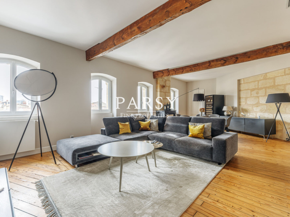 Situé aux derniers étages d’un immeuble pierre sur les quais de Bordeaux, à proximité du tramway B, des commerces et des écoles,